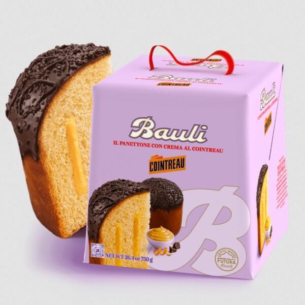 Panettone with Cointreau-flavored cream, covered and decorated with dark chocolate.