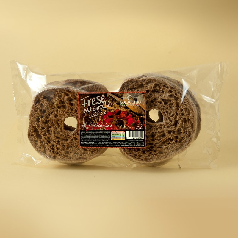 Round Frese wholemeal with chilli, processed according to the Calabrian tradition. Crispy goodness, the Mediterranean taste.