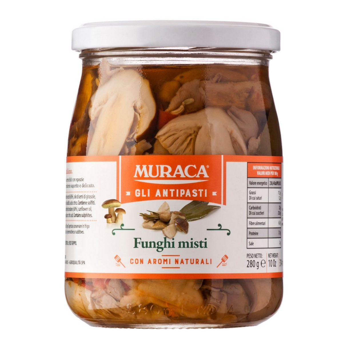 Muraca Mix Funghi Misti (Mixed Mushrooms) are a premium, Calabrian-style, ready-to-eat mushroom antipasto preserved in oil.