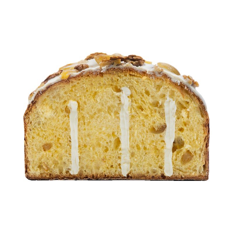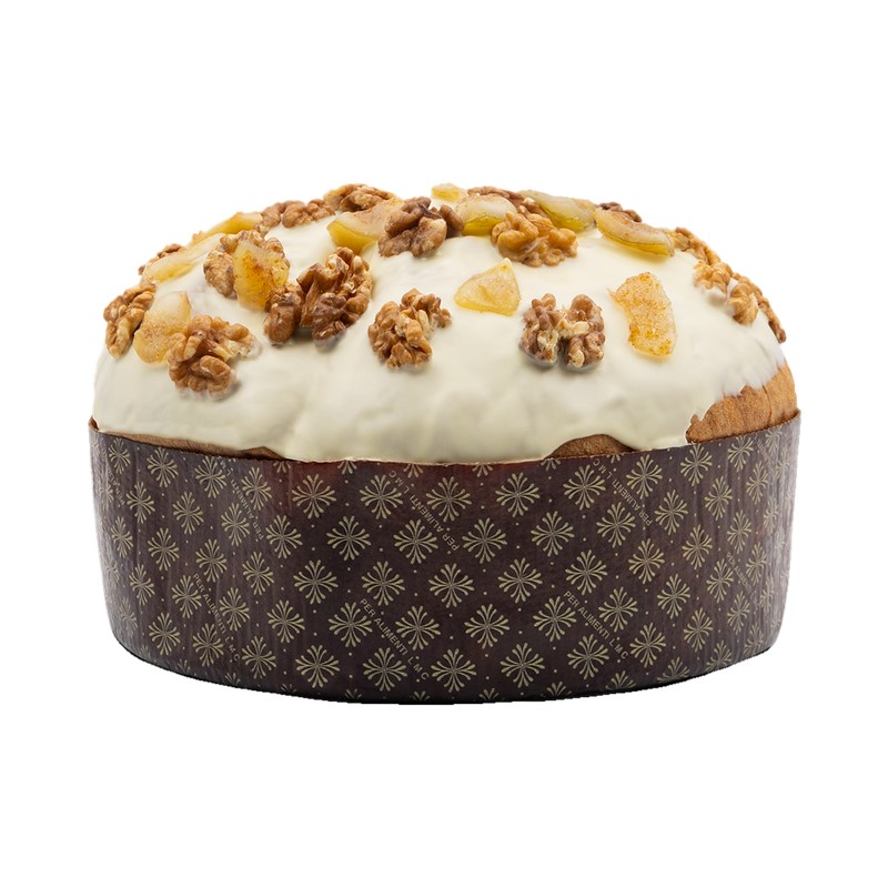 Our Panettone with figs and walnuts is a real delight, soft thanks to the buffalo milk and butter, enriched with honey and vanilla, white chocolate cream and candied figs, with a crunchy touch of walnuts on the topping.