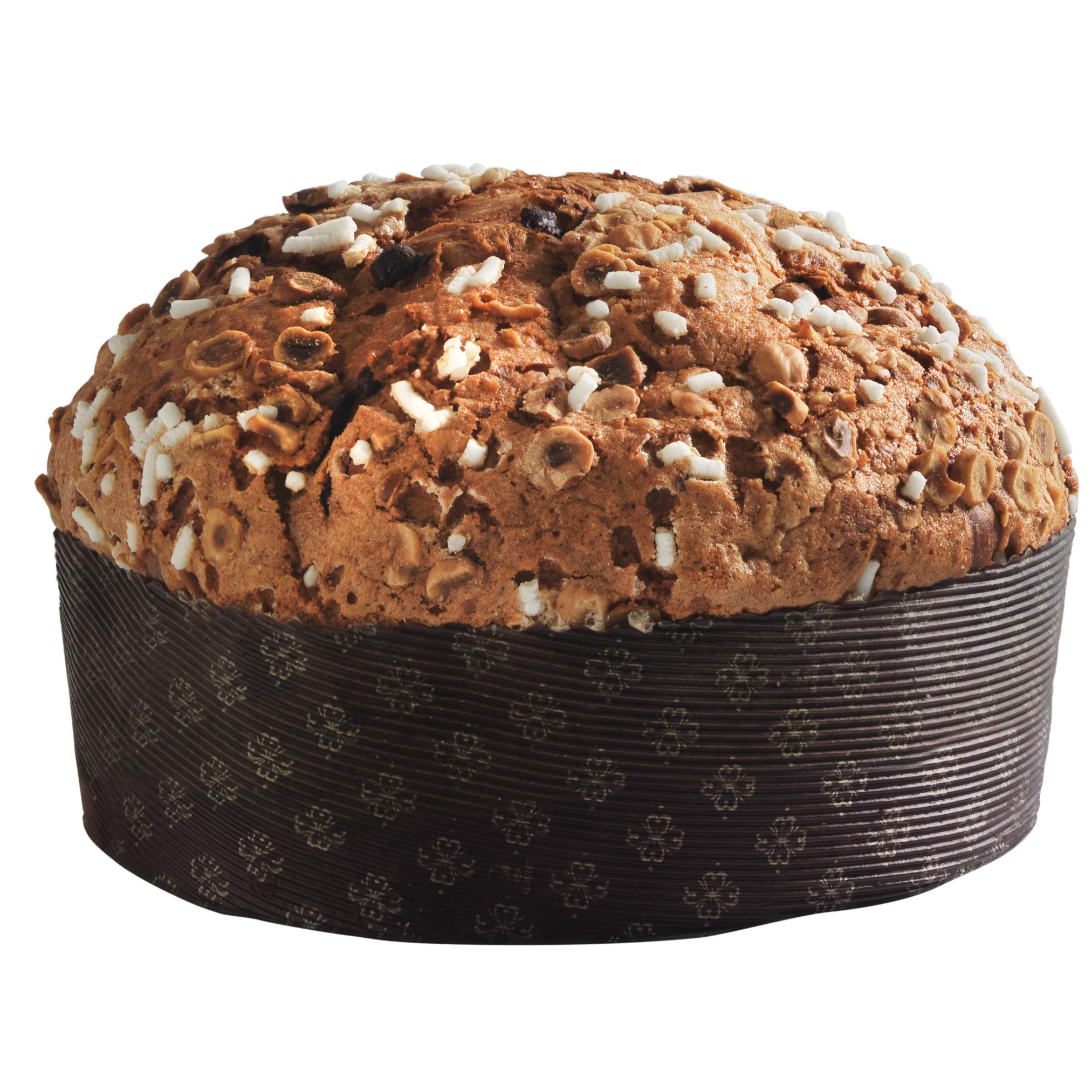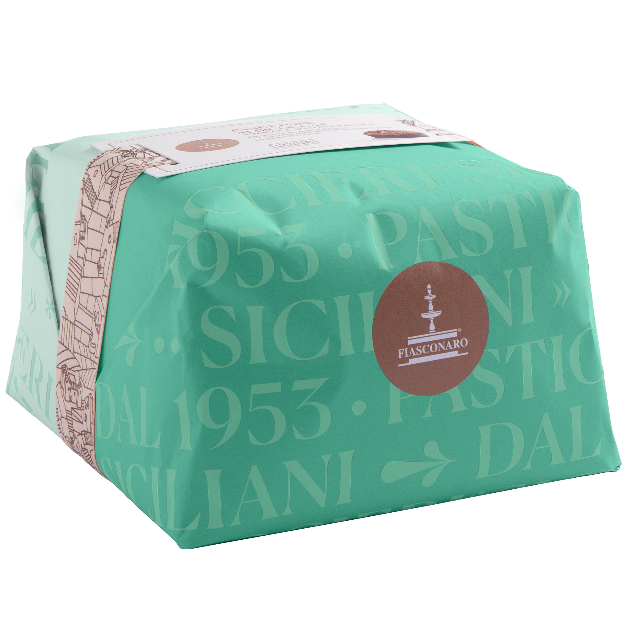 Panettone with candied apricots and “Modica Chocolate PGI” covered with icing and hazelnut foliage, hand-wrapped.