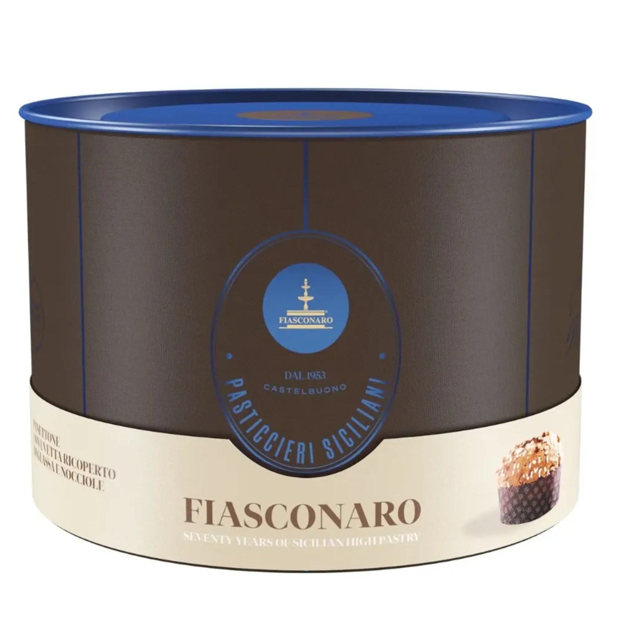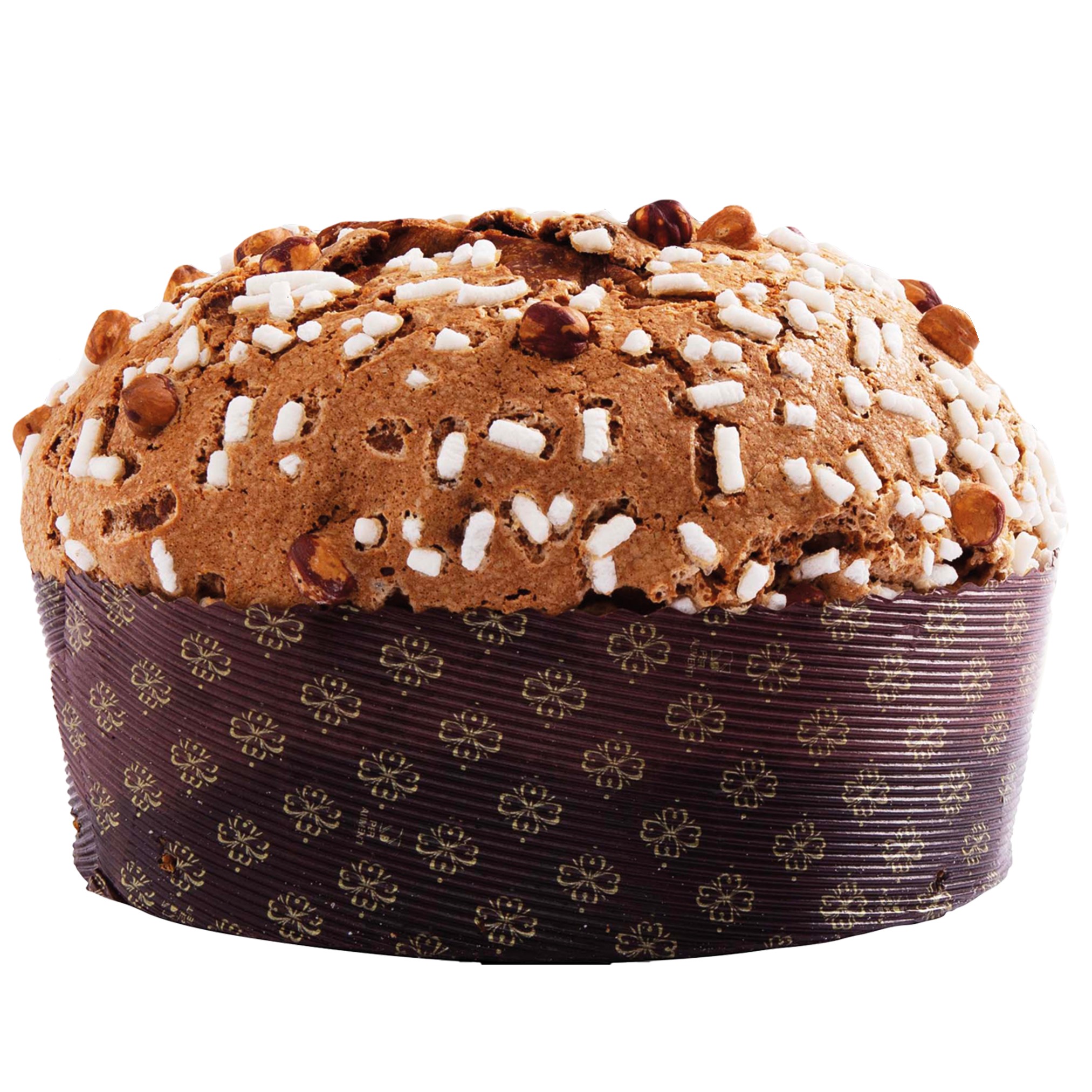 Panettone with raisins covered in icing and hazelnuts, hand wrapped.
