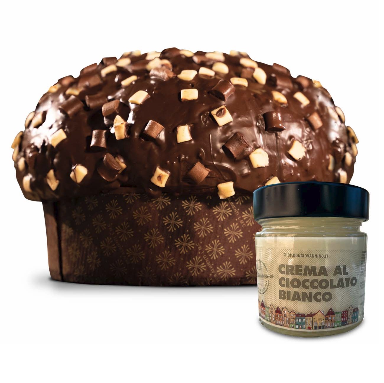 Artisanal 3-chocolate panettone with white chocolate spread.