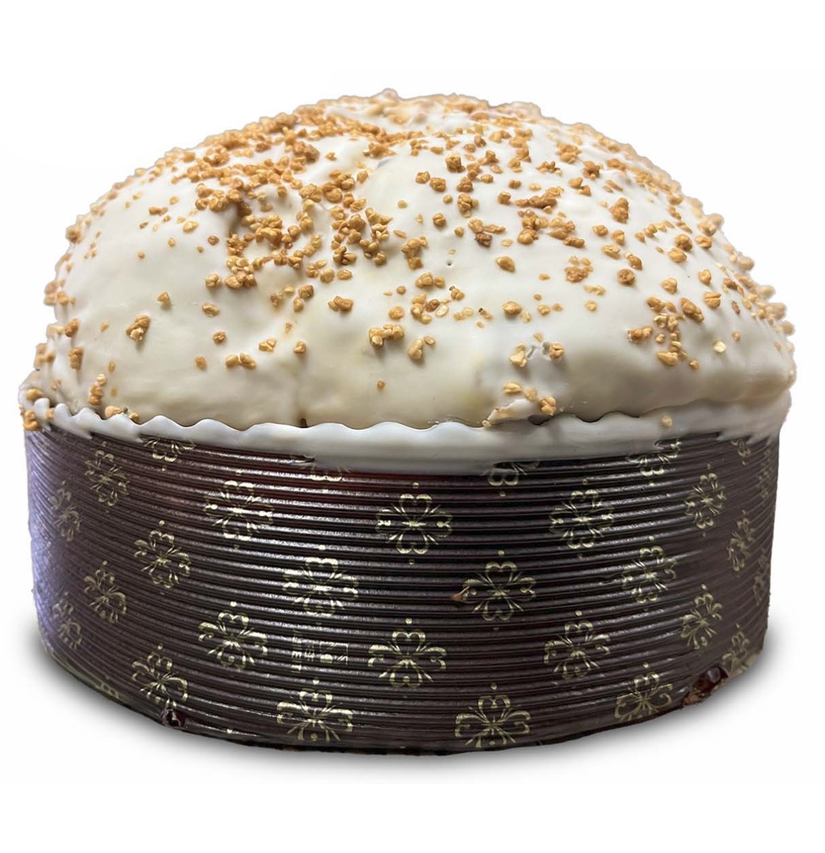 Panettone with salted caramel chips covered with white chocolate and praline caramel.
