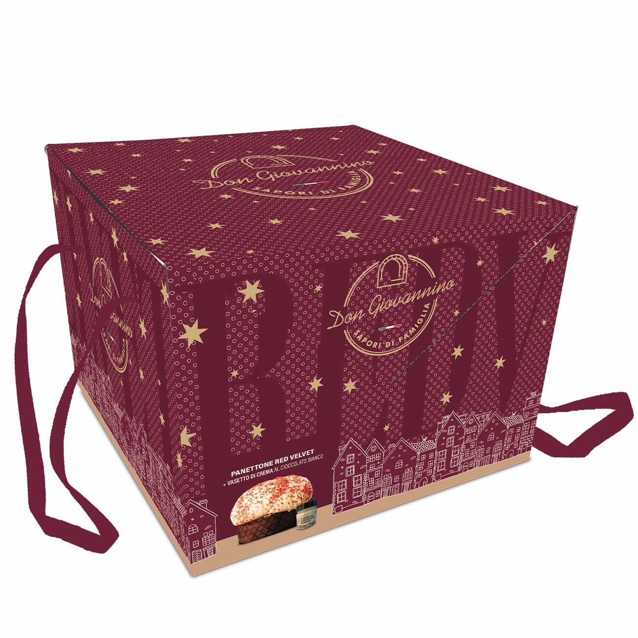 Panettone prepared with a natural red dough mixed with Modica chocolate drops and covered with white chocolate.